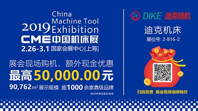 2019CME中國(guó)機(jī)床展于2月26至3月1日,在國(guó)際會(huì)展中心(上海)盛大開(kāi)幕。迪克機(jī)床(展位號(hào):2-B16-2)誠(chéng)邀各位新老客戶參觀指導(dǎo)!主辦方提供優(yōu)惠活動(dòng):凡現(xiàn)場(chǎng)成交訂單(超過(guò)1萬(wàn)的訂單),憑合同+付款憑證(公賬有效)現(xiàn)場(chǎng)抽現(xiàn)金獎(jiǎng),絕對(duì)100%中獎(jiǎng)!最高50000元